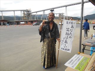「あなたの笑顔は美しい、日本笑一」の旗を掲げ日本縦断中です。ニューヨーク在住パフォーマーだそうです。