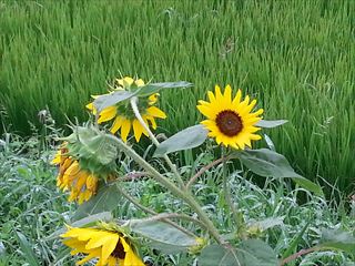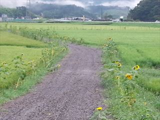 下矢作では、復旧した田んぼの農道にひまわりw歩..を植えています。全体的にはこのような感じ、6~7割ぐらいが咲いています。