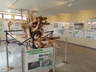 会館内です。中心には被災松の根が展示されています。壁にはパネル展示されています。
