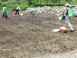 瓦礫撤去後、昨日は石灰をまき、今日、ヒマワリの種まきをする予定です。