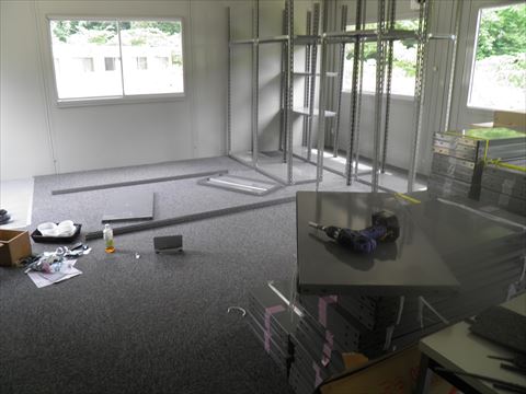 肉体労働ですが、床のカーペット貼り、商品を置くためのラックづくりに追われています。大忙しです。四国中央市の守屋さんから寄贈していただいたインパクトが大活躍です。