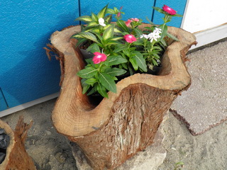 切り株プランターに花を生けています。