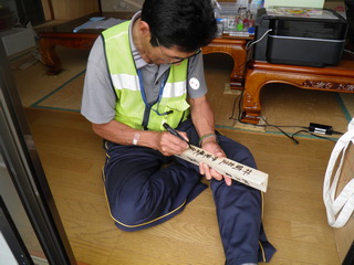 小泉公民館では、京都大文字焼き送り火用の薪に、亡くなった方の名前を書き入れる作業が行われていました。