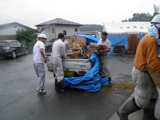 ダンプ組合の方々が支援物資を運び込みます。この軽トラも支援物資として置いていきます。