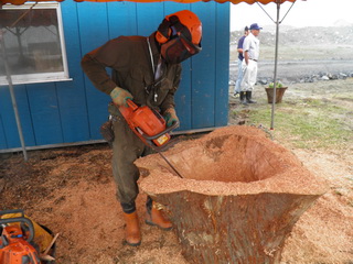 樹齢500年ぐらいの巨大カヤにチェーンソーが入っていきます。