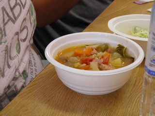 炊き出しは、 ミネストローネ、パン、サラダでした。