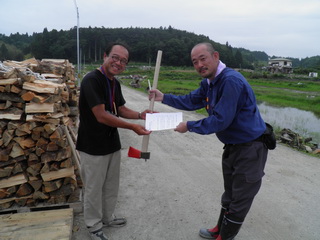 鯖江市から薪割用の斧を贈呈されました。